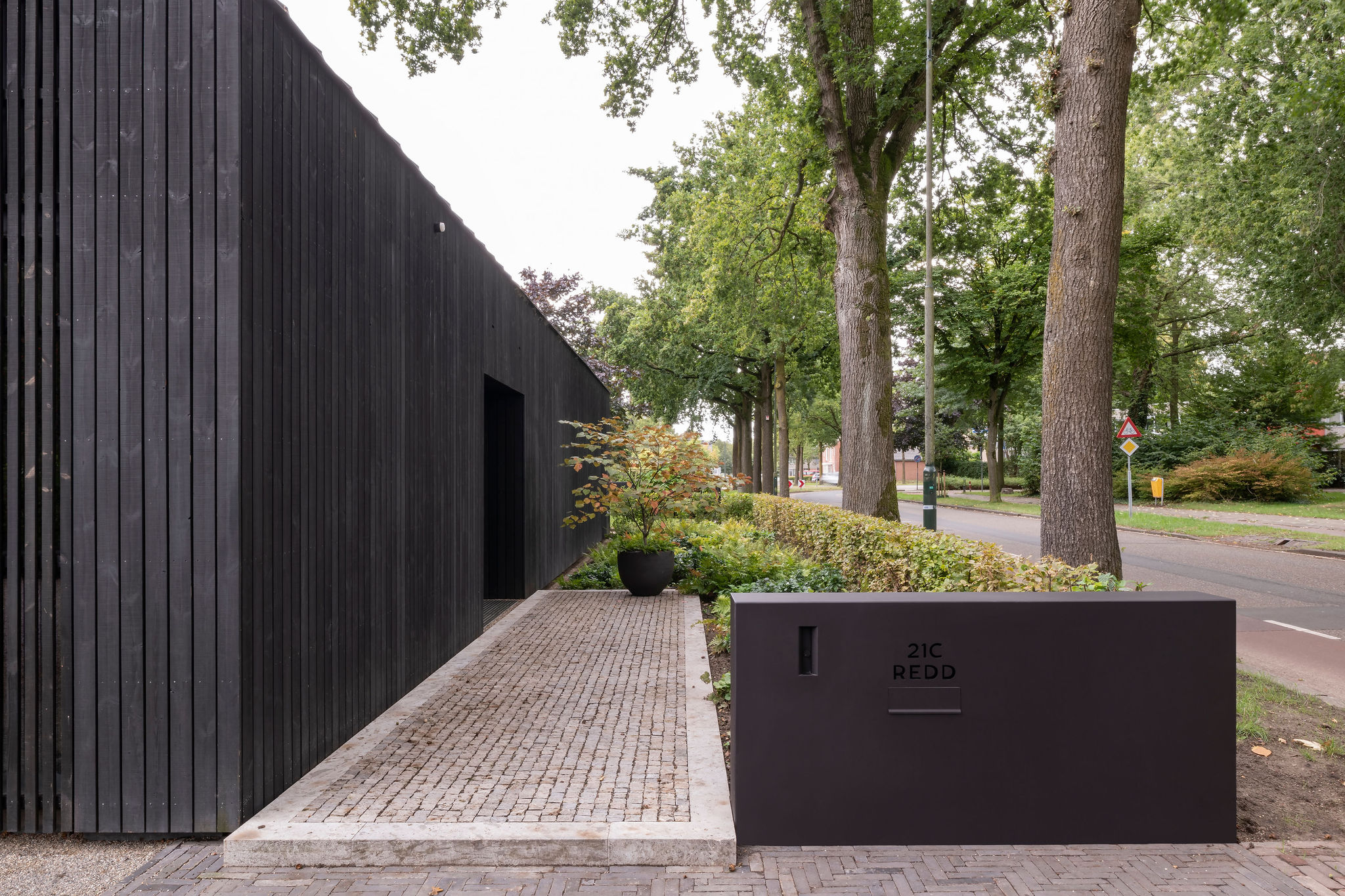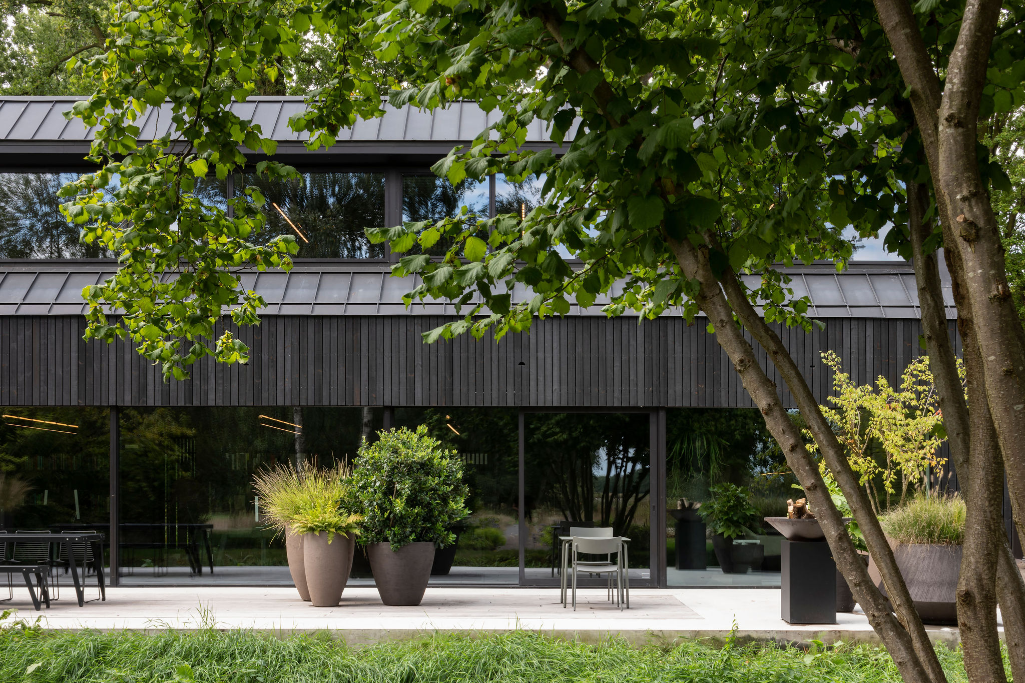 De Black Barn is een ingetogen maar verfijnd volume die alle aandacht op het achterliggende landschap vestigt. De voorzijde dient zich aan als een gesloten schuurvolume en komt voort uit de historische context. De opengewerkte lattenstructuur zorgt op momenten voor een translucente werking die een glimp van het studioleven toont.